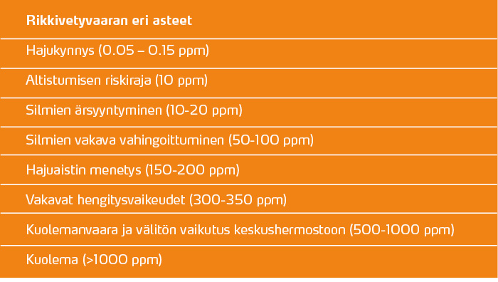 | Rikkivety on laajakirjoinen myrkky. Se vaikuttaa hermojärjestelmään lamauttavasti ja estää soluhengityksen. Jos rikkivetypitoisuus on suuri, yksittäinen hengenveto voi olla tappava. | Rikkivety on erittäin helposti syttyvää. Se muodostaa ilman kanssa räjähtävän seoksen. Jos rikkivetyä joutuu kosketuksiin hapettavien tuotteiden kanssa, seurauksena voi olla tulipalo tai räjähdys. | Ilmaa painavampana rikkivety kertyy matalien kohtien pohjalle. Se muodostaa seisovaan jäteveteen taskuja, joista voi purkautua tappavia määriä kaasua, kun jätevesi liikkuu tai sitä pumpataan putkistoissa. Kaasu lamauttaa hajuhermon, joten ihminen ei havaitse sitä. |
